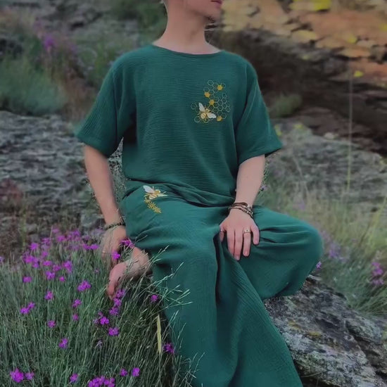 Loose and breathable, these green muslin pants are made from 100% natural cotton and decorated with nature-inspired embroidery. Oversized, gender-neutral fit. Perfect for summer days, beachwear, festivals, or just relaxed everyday looks.