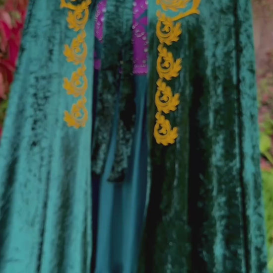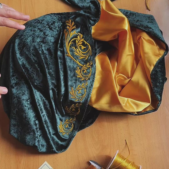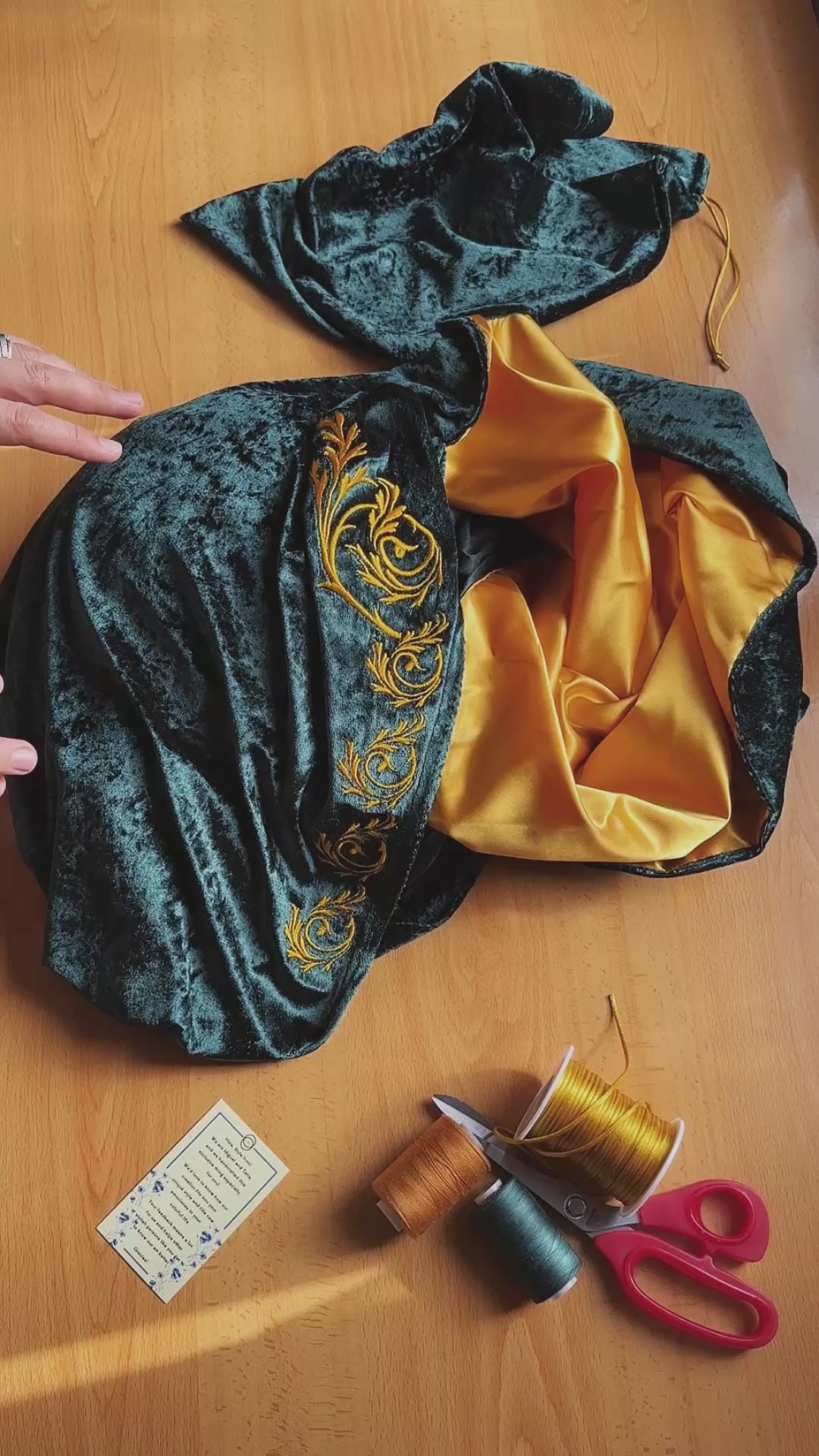 Wrap yourself in magic with this deep green velvet cloak, featuring rich gold lining and elegant Gothic embroidery. Inspired by fantasy worlds and medieval tales, it’s perfect for elves, witches, or lovers of Gothic and Renaissance fashion. Whether you're heading to a themed wedding, Halloween, or fantasy festival — this cloak promises a dramatic and enchanting presence.