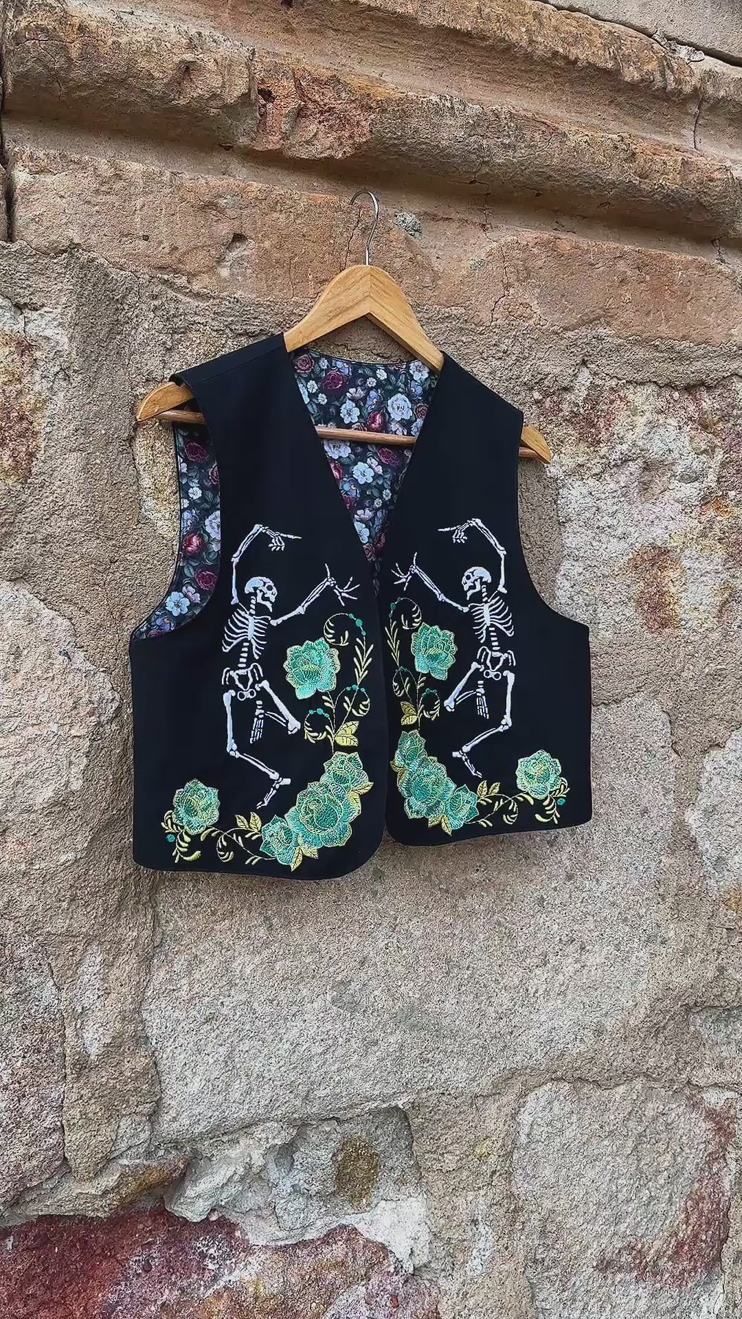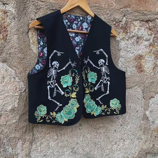 This black cotton vest features dancing skeletons and roses on the front, and a meditating skeleton embroidered on the back. With its boho, ethnic, and rustic aesthetic, it’s a perfect statement piece or gift for weddings, birthdays, festivals, or any celebration of life and individuality.