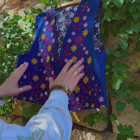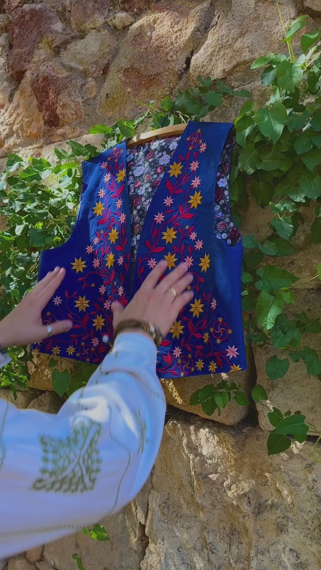 This vibrant blue vest features openwork folk embroidery with star motifs and 215,000 stitches. Made from soft cotton, it’s perfect for weddings, festivals, and winter holidays. The waist-length cut and detailed design offer a bold yet refined look.