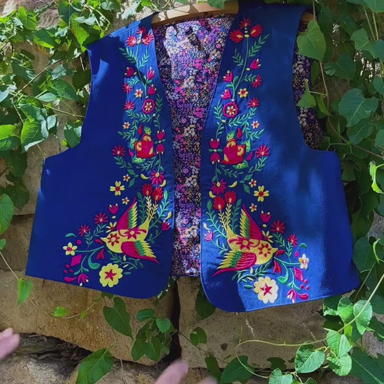 This striking green cotton vest features hypnotic dragon eyes embroidered on the front and a fiery dragon on the back, crafted with 215,000 stitches. With a cropped waist-length cut, it blends boho and fantasy aesthetics — perfect for Halloween, Día de los Muertos, festivals, or bold wedding looks.