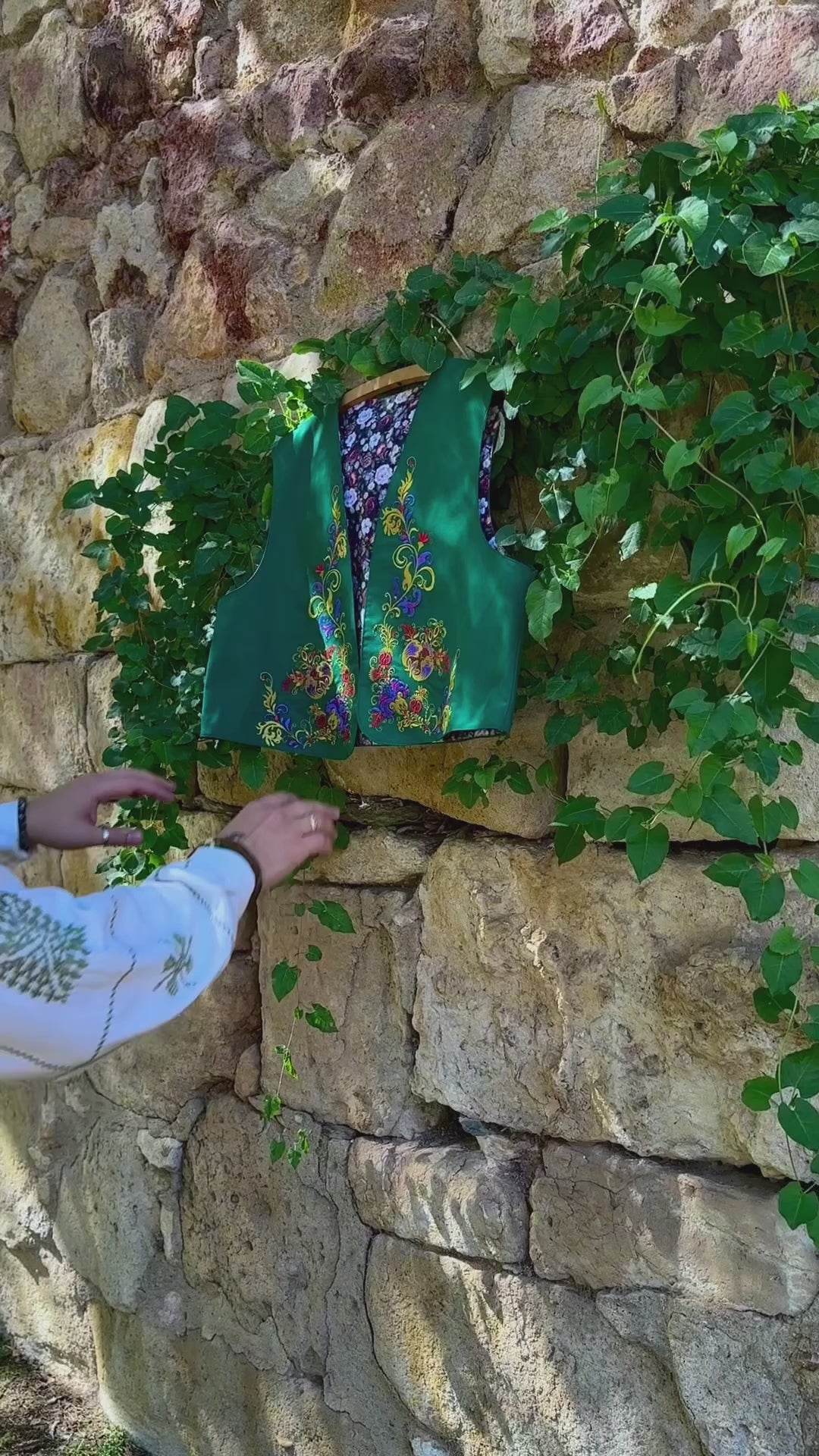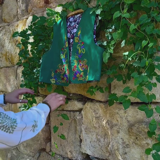 This emerald green cotton vest features intricate traditional ajour embroidery with 210,000 stitches. The waist-length cut and artisan details create a modern look with a vintage boho feel. Perfect for weddings, festivals, and meaningful gifts.