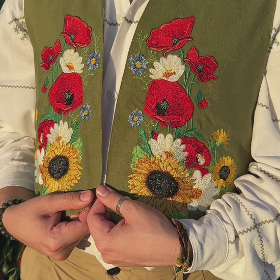 This unique green cotton vest features bright embroidery of poppies, sunflowers, daisies, and violets, blending boho, folk, and rustic styles. A wearable piece of art — perfect for festivals, weddings, and creative gifts.