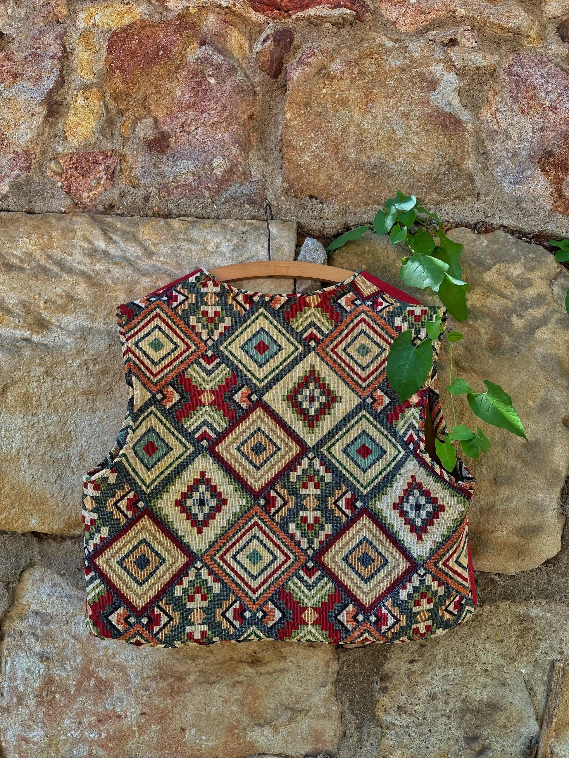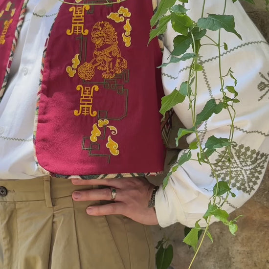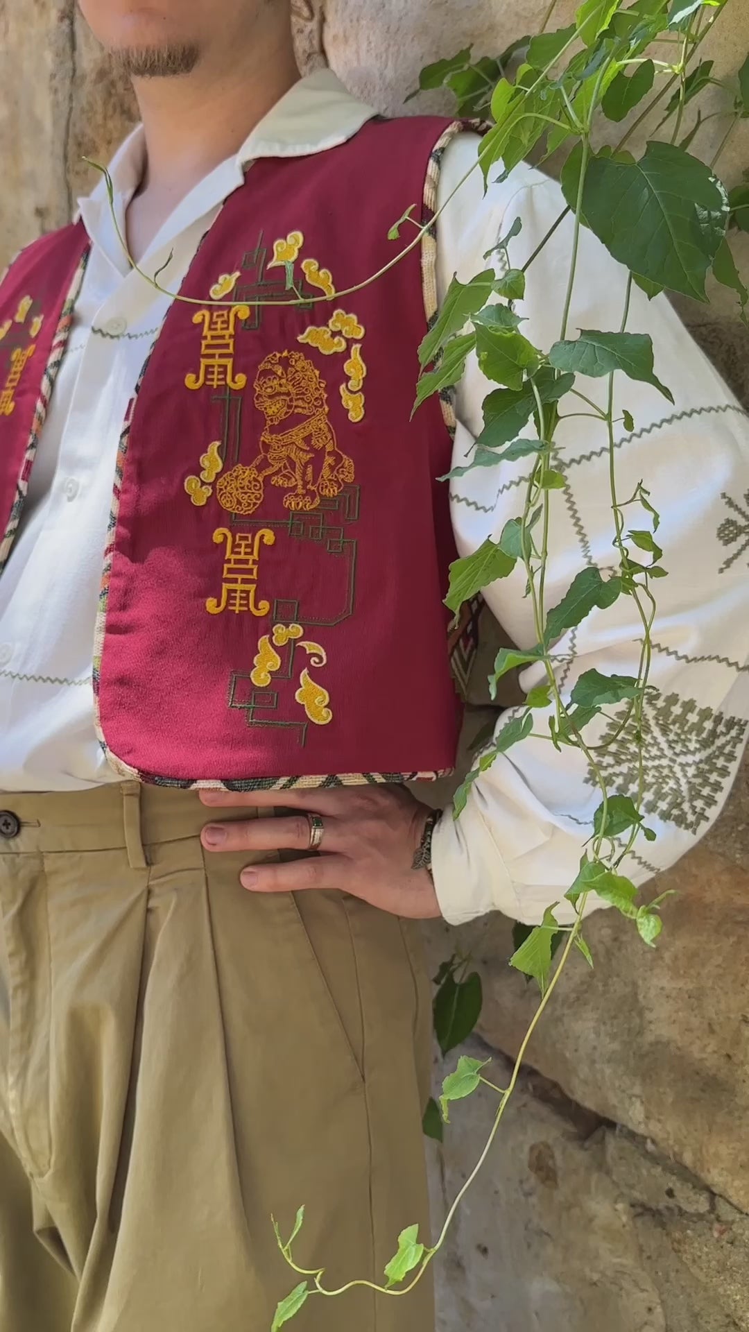 This deep red cotton vest features stunning Chinese-style embroidery of majestic lions and ancient hieroglyphs — including a detailed tapestry on the back. It’s a bold artistic piece that blends ethnic, boho, and vintage styles. Ideal for weddings, New Year, festivals, or as a special gift for someone who values cultural symbolism and craftsmanship.